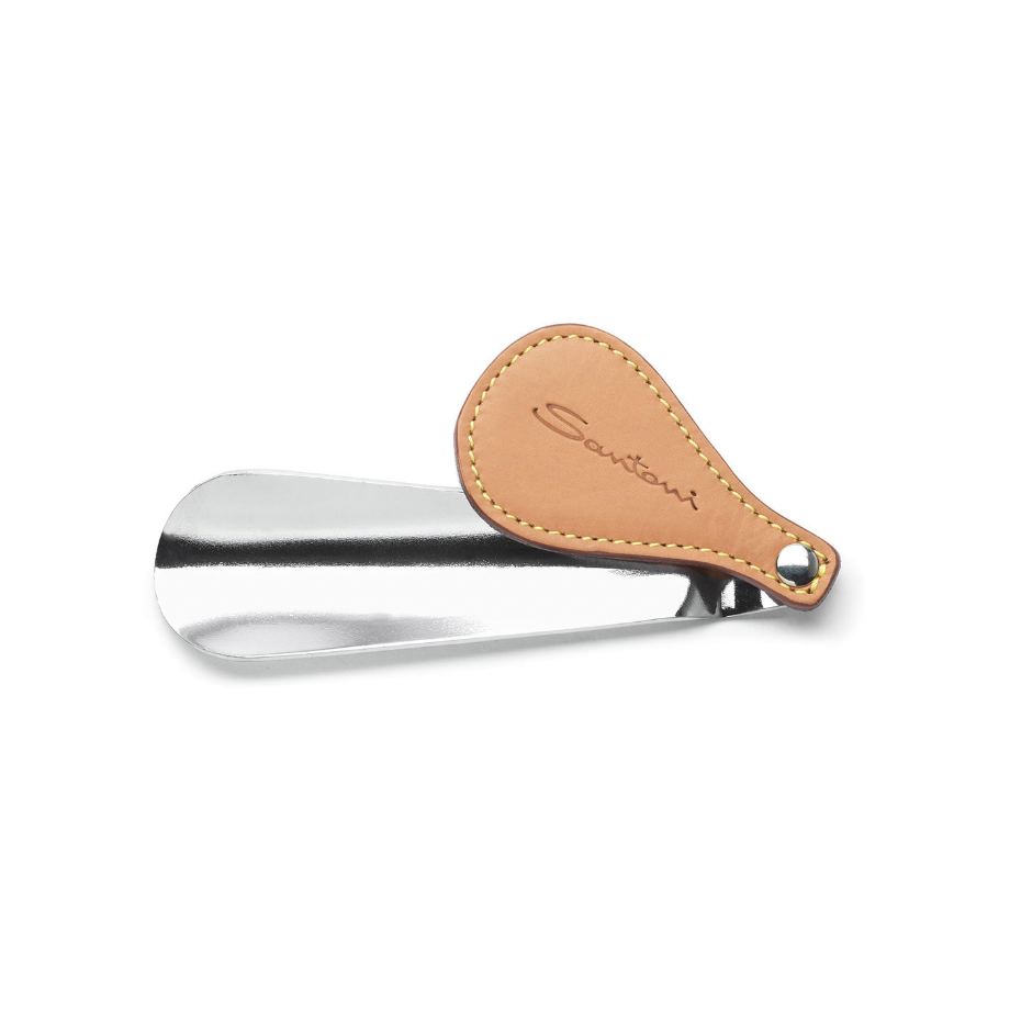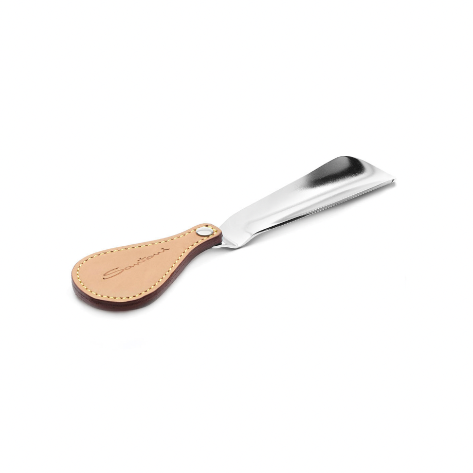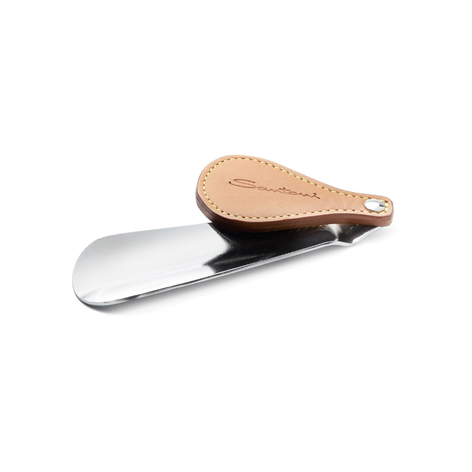 Refined object with a minimal design, the steel shoehorn with leather-colored calfskin handle and visible stitching.