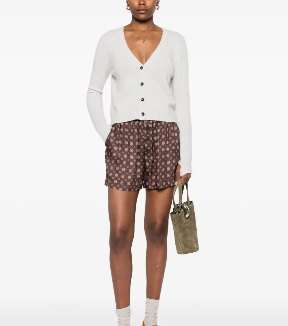 Elegante cardigan in pregiato cachemire e seta che unisce lusso e versatilità. Realizzato in raffinato grigio perla , presenta uno scollo a V che valorizza il décolleté, chiusura con bottoni e maniche lunghe con pratici anelli per i pollici. L'orlo in costina garantisce una vestibilità impeccabile e una silhouette raffinata. Un capo essenziale per chi apprezza la qualità dei materiali nobili e lo stile senza tempo.