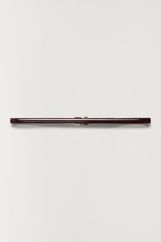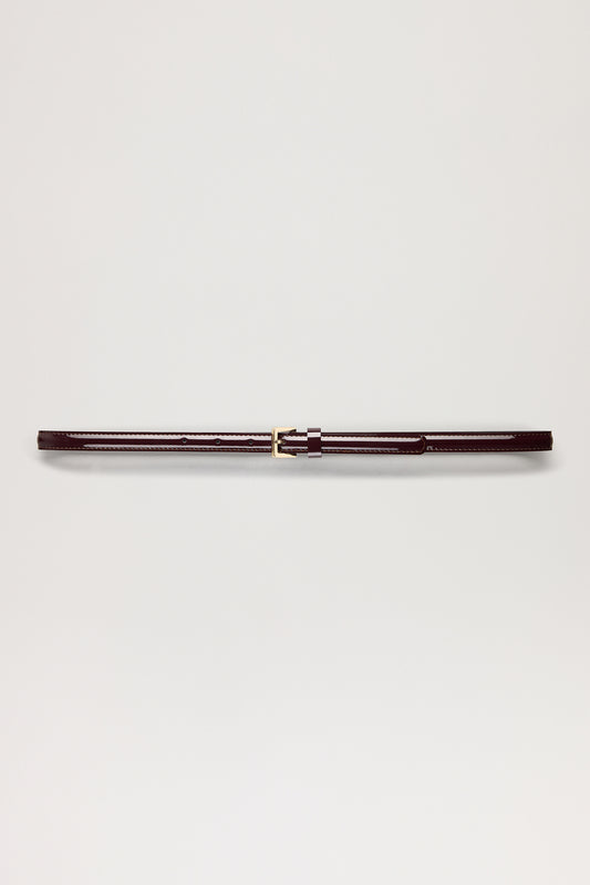 Questa cintura sottile in pelle verniciata nera unisce eleganza e raffinatezza. La finitura lucida valorizza ogni outfit, mentre la fibbia piccola e dorata aggiunge un tocco discreto di lusso. Perfetta per definire la vita con stile senza appesantire l’insieme.