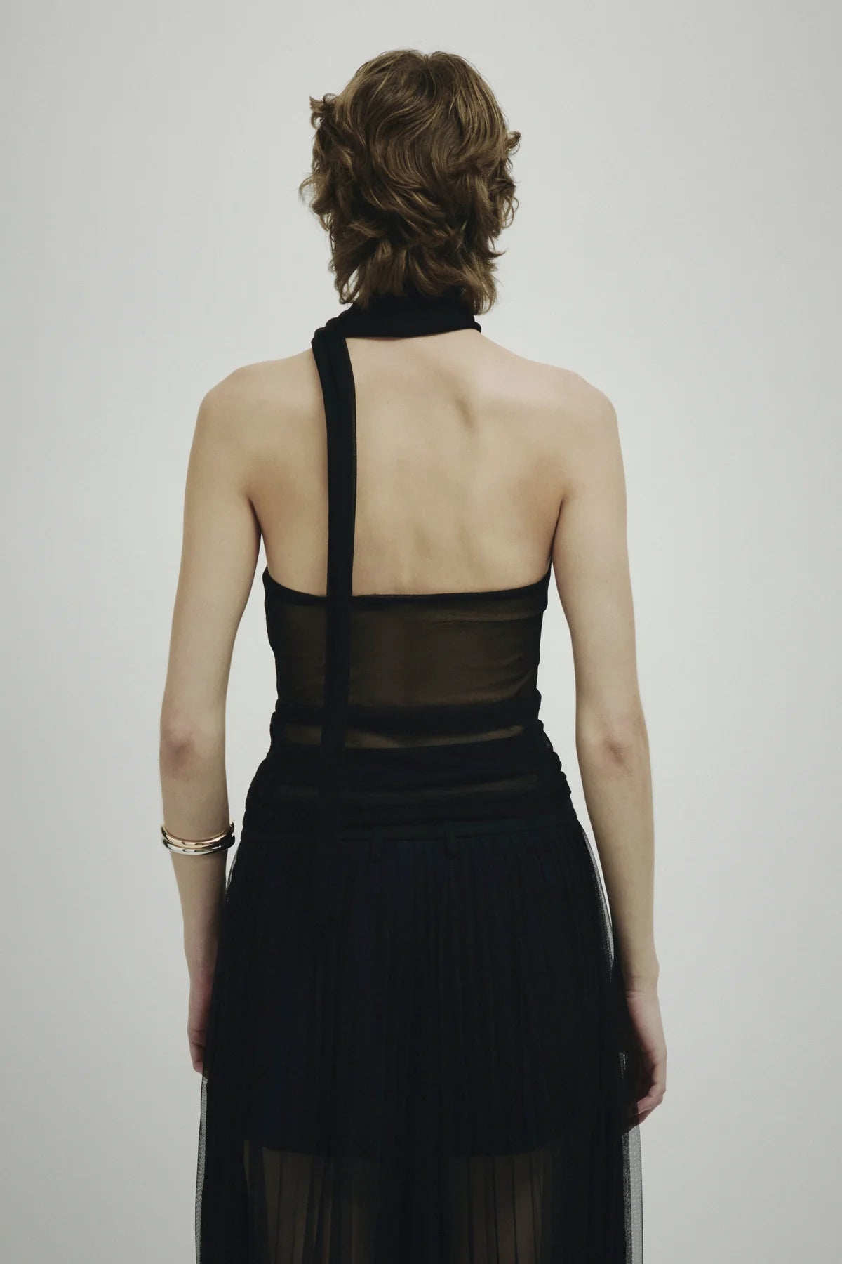 Top elegante in viscosa con fascia anteriore a costine che definisce la silhouette. La schiena e la sciarpa sono realizzate in garza di viscosa trasparente, creando un contrasto sofisticato tra la struttura del davanti e la leggerezza del retro. Un capo versatile che combina comfort e raffinatezza, perfetto per occasioni che richiedono un tocco di eleganza contemporanea.