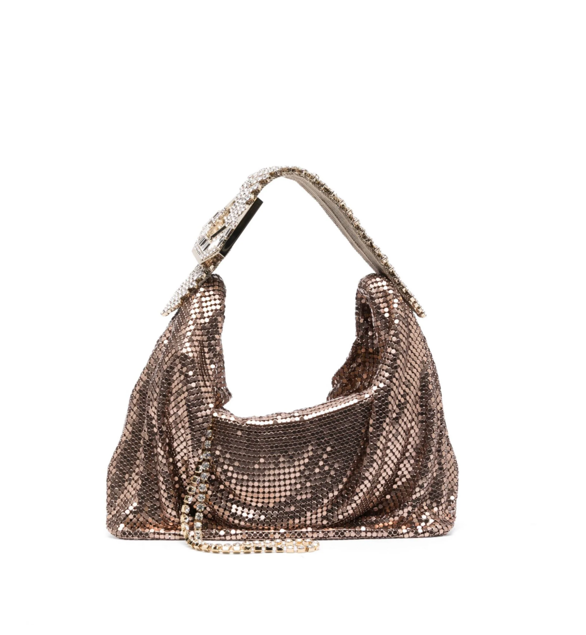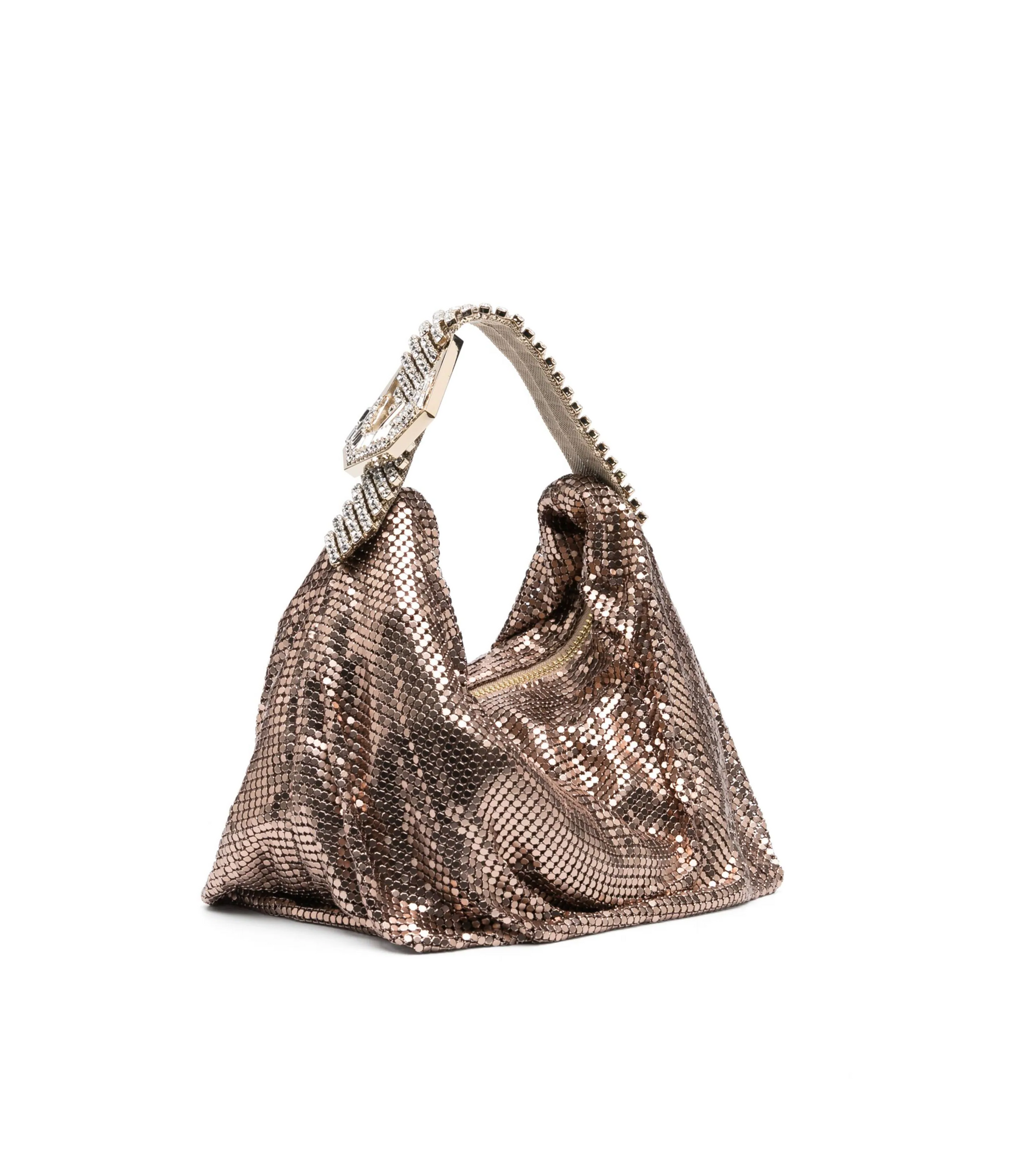 La Borsa a Mano Jill Rose Gold è il perfetto accessorio per completare il tuo look. Realizzata con una sofisticata fibbia e applicazioni di pietre, questa borsa gioiello in metallo rose gold è dotata di una comoda chiusura a cerniera. Aggiungi un tocco di eleganza al tuo outfit con questa splendida borsa.