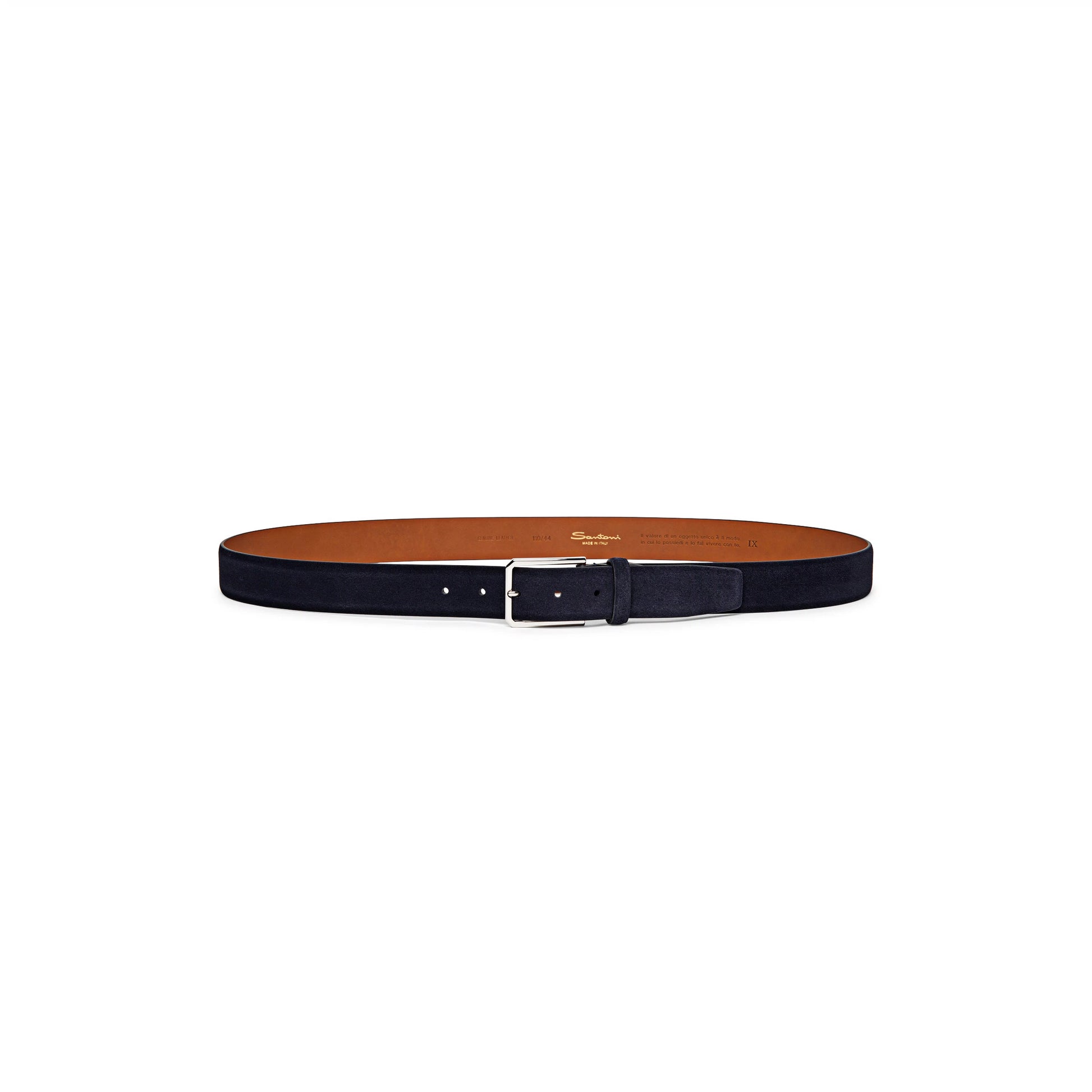 Un accessorio sofisticato e versatile, dedicato a chi sceglie lo stile Santoni anche nei dettagli. Questa cintura da uomo è realizzata in suede pregiata con interno in pelle arancione, colore iconico della maison. Si regola e si chiude con una fibbia in metallo dalla linea squadrata ed elegante.