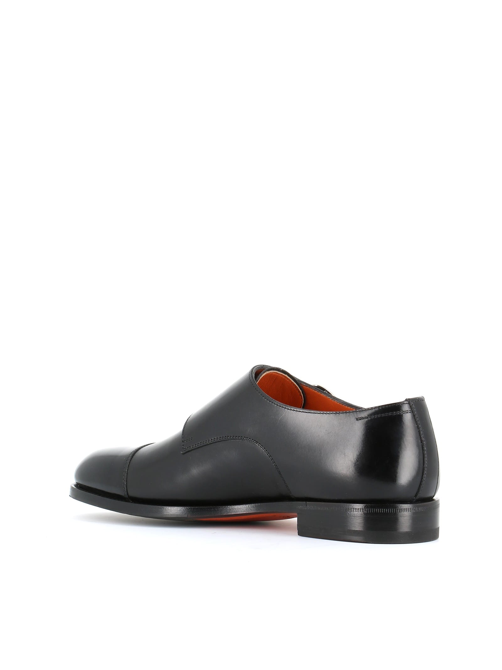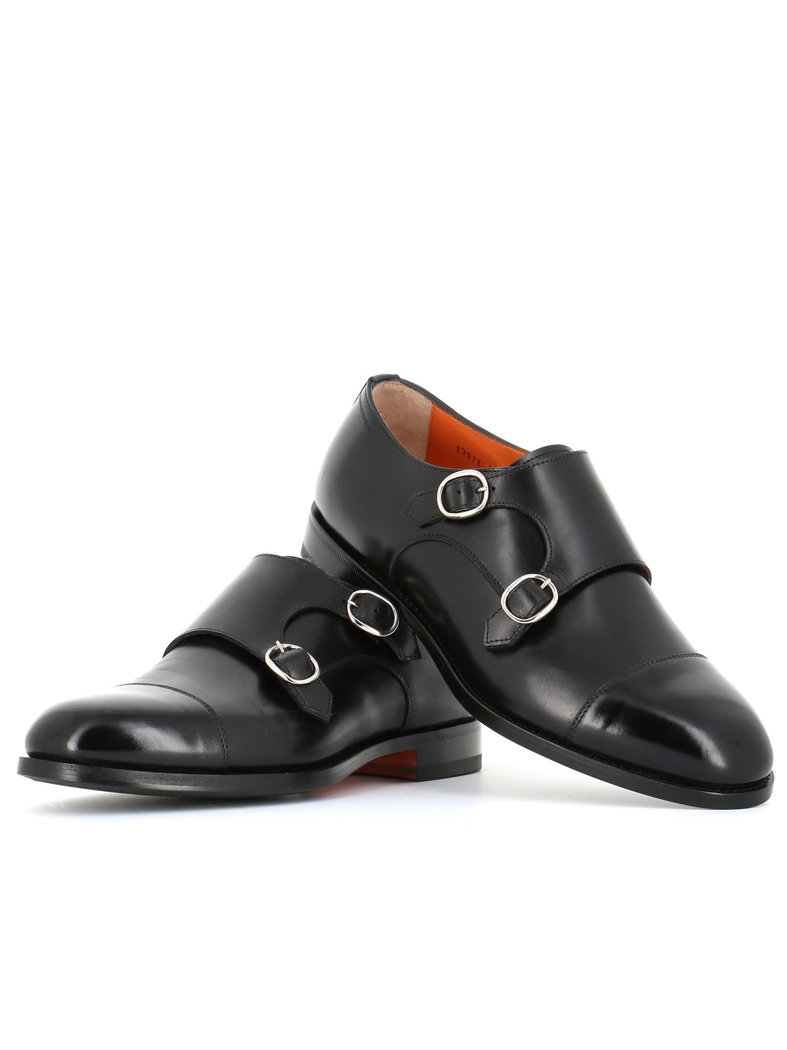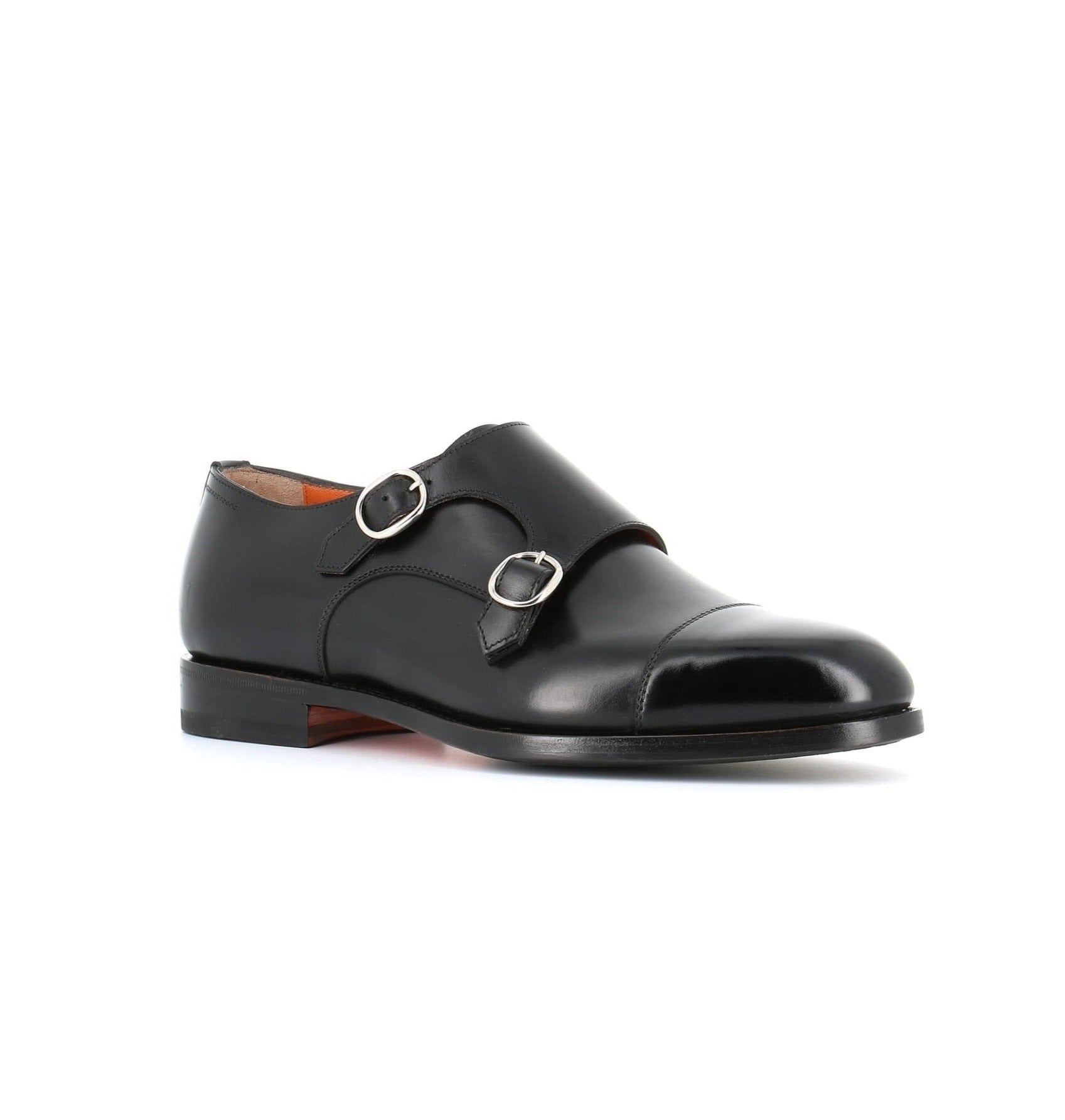 Doppia fibbia, modello 'Colin', realizzata in pregiata pelle semi-lucida nera con cucitura cap-toe sulla punta a mandorla. Cuciture in rilievo. Doppia fibbia in metallo argento. Fondo in cuoio con mezza suola e mezzo tacco con inserto antiscivolo in gomma. Interno foderato. Tacco: 2,5 cm