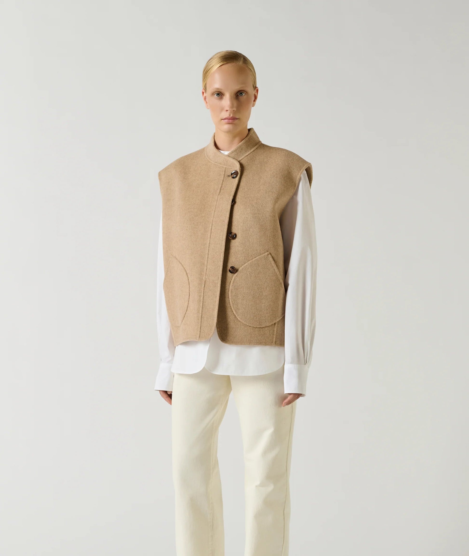 ADELINE è il gilet senza maniche che reinterpreta l'eleganza minimalista della nostra celebre giacca WINDSOR. Realizzato in lana double face beige melange, questo capo versatile presenta spalle scivolate e un taglio oversize arrotondato che lo rende perfetto da stratificare secondo il vostro stile. Il collo alto asimmetrico e le tasche applicate rotonde aggiungono carattere distintivo, mentre la chiusura semi-nascosta con bottoni mantiene le linee pulite e raffinate. La lana spessa non è foderata, garantendo libertà di movimento anche indossato sotto un cappotto, senza compromessi sulla comodità.