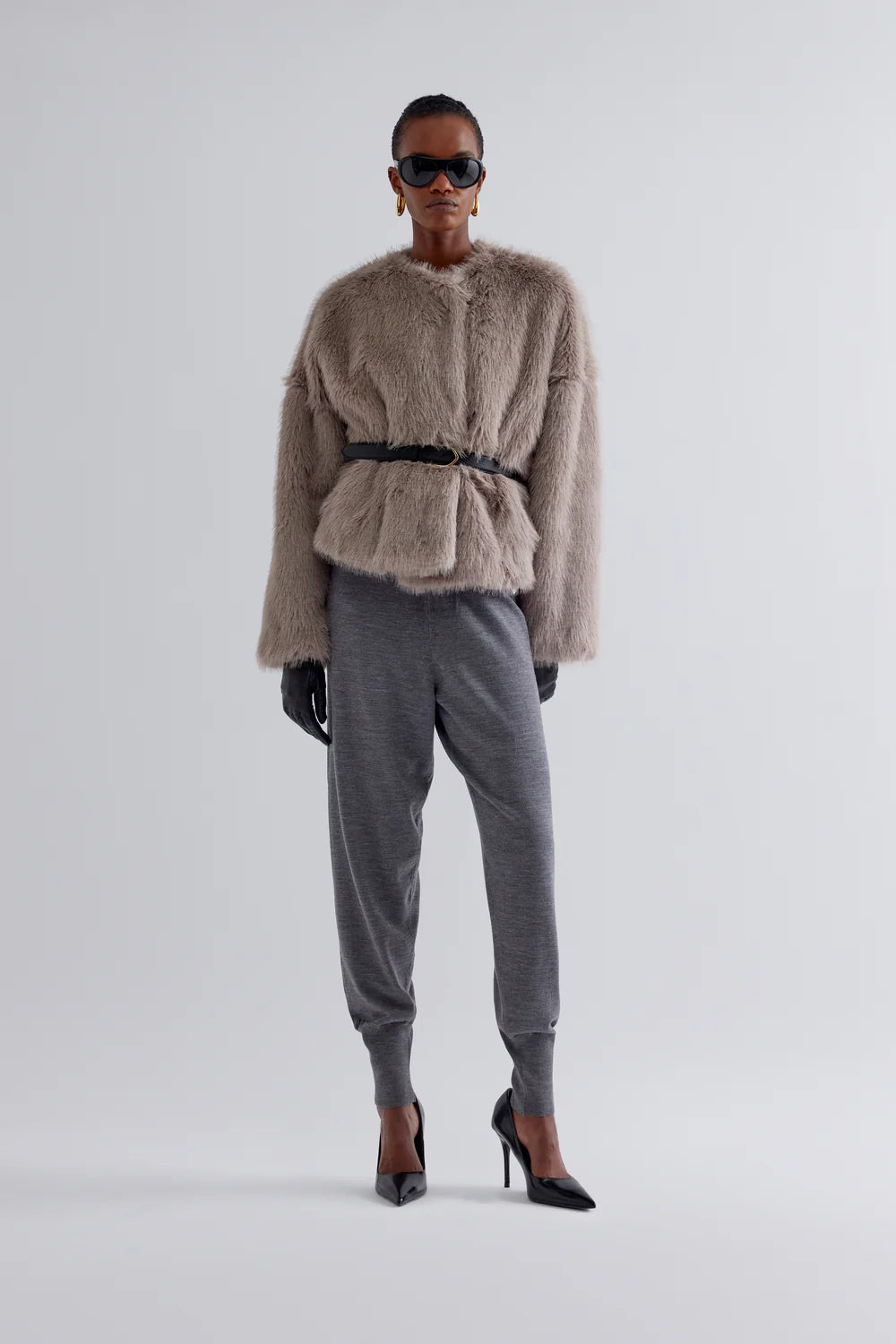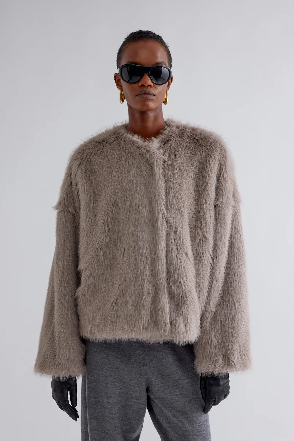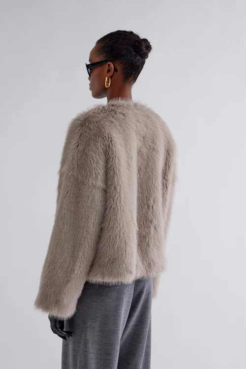 Questa pelliccia corta color tortora offre un design raffinato con girocollo e maniche scese per un comfort superiore. Foderata internamente, garantisce calore e vestibilità elegante. L’allacciatura frontale con ganci assicura una chiusura pratica e sicura, valorizzando un capo classico e versatile ideale per completare outfit sofisticati durante le stagioni più fredde.