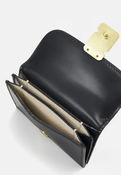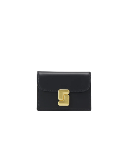 Il portacarte AUBE unisce design compatto e funzionalità. Realizzato in pelle nera smaltata con finiture dorate e cuciture a mano, ideale per le borse più piccole. Offre tre scomparti a soffietto e si chiude con un pratico bottone automatico. Il monogramma "S" sottolinea l’esclusività di questo accessorio in pelle certificata LWG, ideale per organizzare carte e monete con stile e rigore.