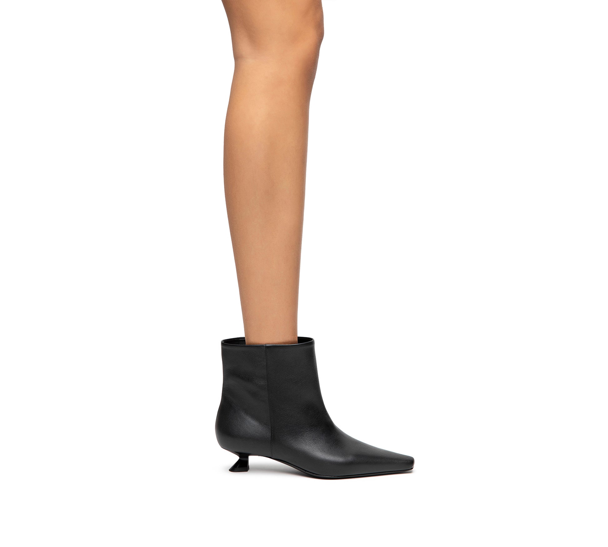 Stivaletto in pelle nera con tacco di 35mm e punta affusolata che unisce eleganza e praticità. La silhouette snella valorizza la gamba senza compromessi sul comfort, grazie all'altezza moderata del tacco che consente un'usura prolungata. La pelle di qualità assicura resistenza e una naturale evoluzione estetica nel tempo. Ideale per chi ricerca un pezzo versatile capace di elevare look quotidiani con un tocco di raffinatezza senza eccessi.