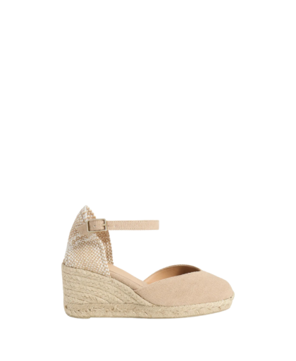 Iconica zeppa Castaner in cotone organico con chiusura a cinturino, soletta imbottita e zeppa in juta di 7 cm.